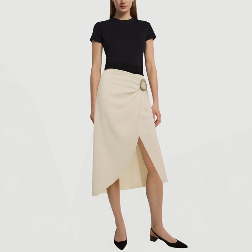 This women’s maxi skirt features a classic A-line design with a naturally flared hem, creating a smooth and elegant silhouette that flatters the legs and enhances feminine elegance. The warm, soft beige hue creates a simple and elegant look that’s versatile and suitable for a variety of casual and everyday wear, effortlessly creating a natural and stylish look.The skirt features side buckles and a front slit, adding a unique design and functionality. The side buckles allow for easy waist adjustment, enhancing comfort and a snug fit, while the front slit adds a touch of movement and style. Made from 100% polyester fabric, garment-dyed, it boasts vibrant, even-toned colors, high colorfastness, and durability. The woven fabric is dense and finely textured, offering excellent breathability and long-lasting comfort, perfect for spring and summer wear.Care Instructions:Hand wash in cold water on a gentle cycle to preserve the fabric and buckles.When machine washing, turn the skirt inside out and place it in a laundry bag on the gentle cycle to reduce wear and deformation.Avoid using detergents containing bleach to prevent color fading and fabric damage.Dry naturally in the shade after washing, away from direct sunlight to preserve the vibrant colors and elasticity of the fabric.Do not tumble dry at high temperatures to prevent shrinkage and deformation, and to preserve the skirt’s shape.Ironing is recommended on a low heat, inside out, gently ironing, avoiding the buckle area to protect the fabric and decorative details.Wash separately from lighter or similarly colored items to minimize staining and wear, extending the life of the skirt.