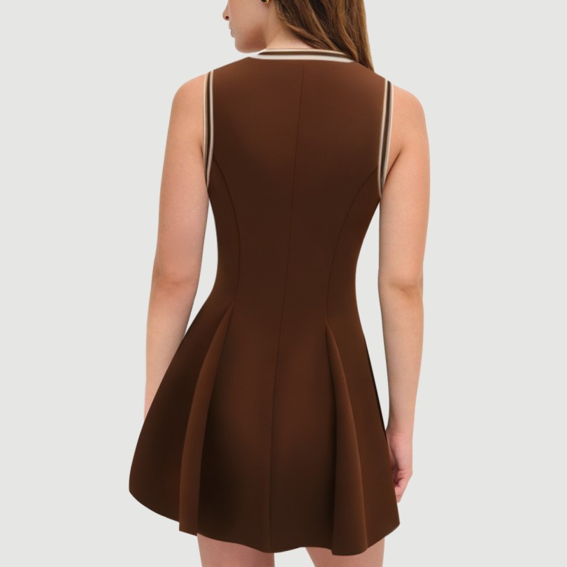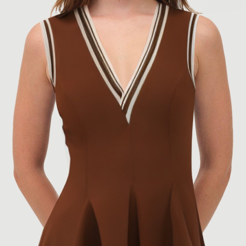 This summer mini dress features a classic V-neck design and sleeveless silhouette, showcasing the elegant lines of a woman’s neck and slender arms for a refreshing and effortless summer look. The delicate pleating of the skirt adds layering and visual interest, adding a touch of movement and style. The loose, comfortable silhouette is perfect for casual everyday wear, creating a relaxed yet sophisticated look.The fabric is made of 100% polyester and woven with a fine, durable texture, offering excellent breathability and abrasion resistance, ensuring long-lasting comfort and durability. The warm, natural brown hue complements many skin tones and easily coordinates with a variety of shoes and accessories, creating a simple and stylish summer casual look.This dress not only focuses on appearance but also on comfort and practicality, making it an ideal summer wardrobe piece for shopping, dating, or everyday gatherings.Care Instructions:Hand wash in cold water with a mild neutral detergent and avoid bleach. When machine washing, turn the garment inside out, place in a laundry bag, and select the gentle cycle. Keep the water temperature below 30°C to prevent shrinkage and fabric damage. Gently squeeze out excess water after washing, avoiding wringing to maintain the pleat structure. Hang to dry in a cool, well-ventilated area, away from direct sunlight, which can cause fading. Use a low heat setting when ironing to avoid damaging the fabric fibers. Wash separately from similarly colored items to prevent staining and contamination.