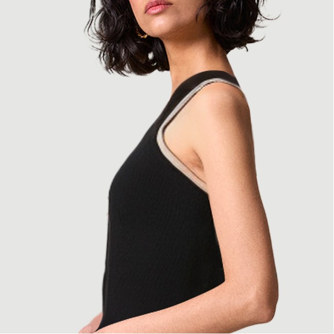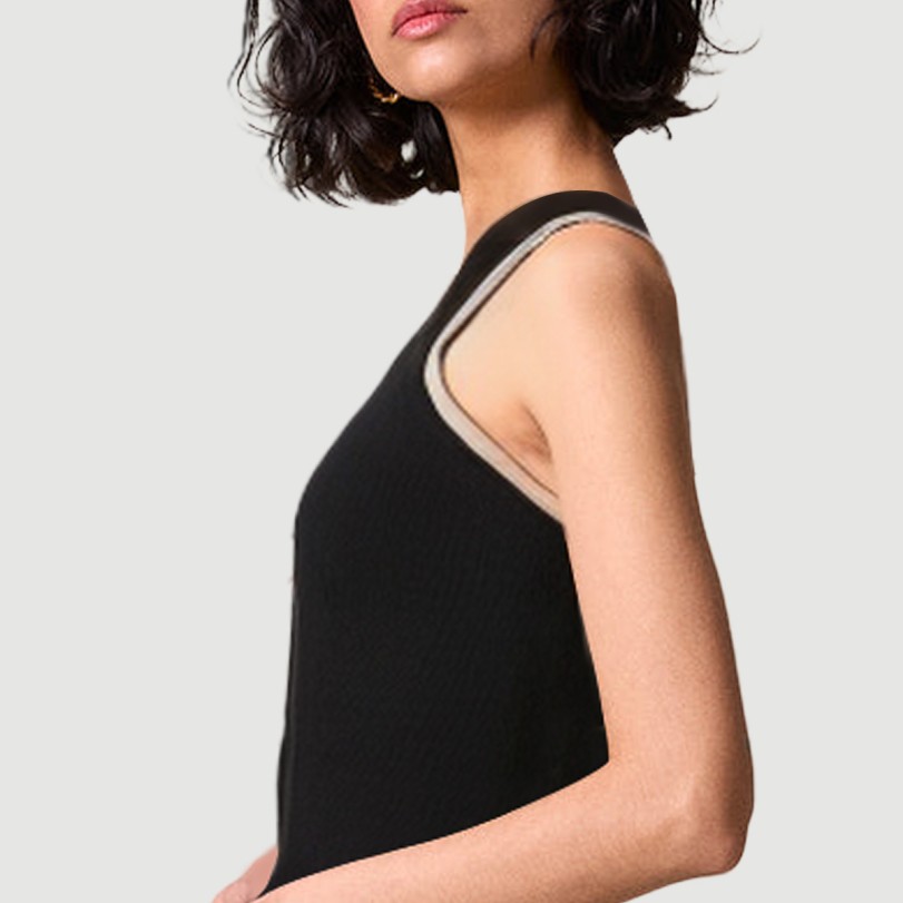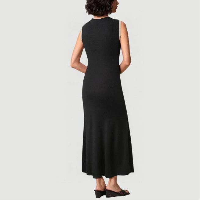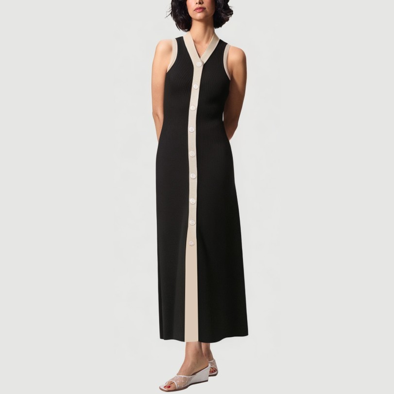 This maxi dress combines style and comfort, perfect for summer holiday leisure. Its sensual V-neck and sleeveless design accentuate the neck and shoulders, creating a fresh and breathable feel. Contrasting colorblocking adds visual dimension and vitality to the overall look, embodying a modern and chic aesthetic. The single-breasted design offers both functionality and a simple, elegant detail, allowing for easy adjustment and comfort.The extra-long length and flowing hem gracefully drape, showcasing a woman’s slender figure. Perfect for a variety of casual occasions, from vacations to casual days and outdoor gatherings. Made of high-quality polyester with a knitted finish, the fabric is soft, stretchy, and breathable, ensuring long-lasting comfort. The overall style is casual and stylish, balancing practicality with style.Care Instructions:Hand wash in cold water with a mild, neutral detergent and avoid bleach. Turn the skirt inside out when washing to preserve the fabric’s color and structure. Machine wash in a laundry bag, using the gentle cycle at no more than 30°C. Gently squeeze out excess water and avoid wringing to preserve the shape and stretch of the skirt. Hang to dry in a cool, well-ventilated area, away from direct sunlight, which can cause fading and fabric degradation. Use a low-temperature steam iron to avoid damaging the fabric with high temperatures. Wash separately from similarly colored items to prevent staining and color transfer.