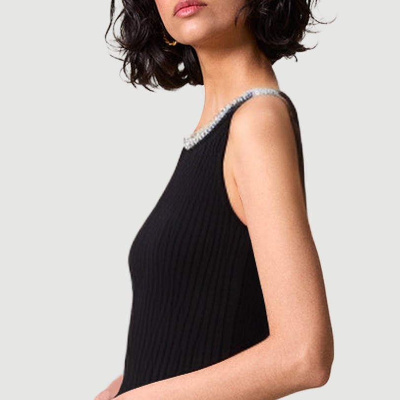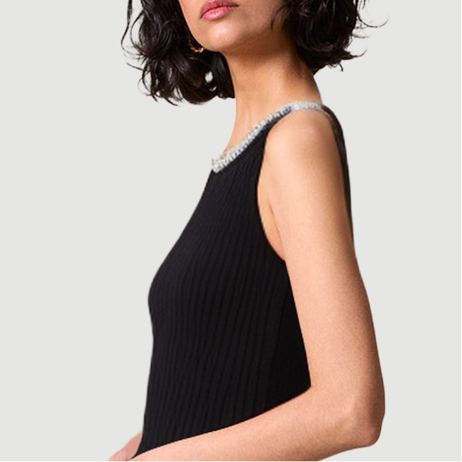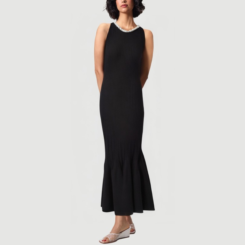 This dress blends elegant design with fashionable elements. Its sleeveless, backless silhouette showcases captivating shoulders, neck, and back curves, perfectly embodying feminine charm. The 3D mermaid skirt flatters the figure, adding a touch of elegance and movement. The mini length makes it perfect for summer, creating a refreshing and stylish look. The solid color scheme is simple and elegant, while delicate rhinestone embellishments add a touch of opulence, enhancing the overall quality and visual appeal.The dress is crafted from a non-woven blend of viscose and nylon, knitted to ensure a soft, comfortable, and breathable fabric perfect for warm summer weather. The lack of prints enhances the fabric’s texture, making it suitable for casual wear in a variety of settings, showcasing confidence and elegance.Care Instructions:Hand wash in cold water with a mild, neutral detergent and avoid bleach. Turn the skirt inside out before washing to protect the rhinestones and fabric details. Machine wash in a laundry bag, using the gentle cycle and water temperatures not exceeding 30°C. Gently squeeze out excess water and avoid wringing to prevent deformation and loss of the rhinestones. Hang to dry in a cool, well-ventilated area, away from direct sunlight, which can cause fading and fabric degradation. Use a low-temperature steam iron to avoid direct contact with the rhinestones. Wash separately from similarly colored items to prevent staining and color transfer.