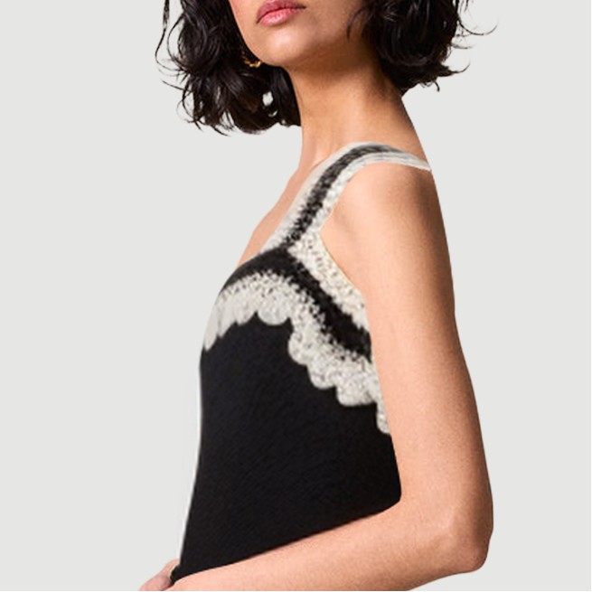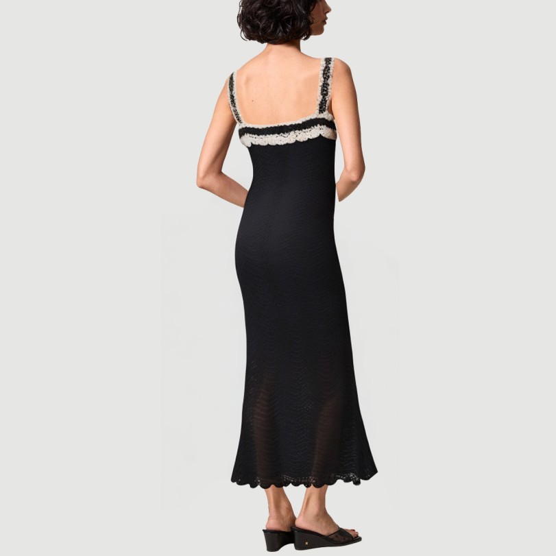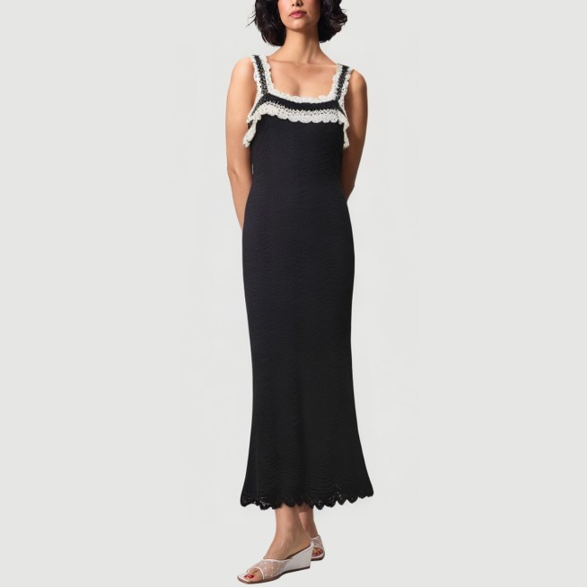 This skirt features a unique openwork knit design that cleverly showcases the curves and elegance of a woman’s figure. The slim fit hugs the body, creating a smooth silhouette. The midi length perfectly flatters the leg proportions, making it perfect for summer wear, combining style and comfort. The classic black color lends the look an understated luxury, making it versatile for everyday outings and parties.The skirt is crafted from high-quality polyester, knitted and dyed to ensure a soft, stretchy, and breathable fabric perfect for hot summer weather. The design, rich in details, balances practicality and fashion, showcasing the independence and confidence of modern women.Care Instructions:Hand wash in cold water with a mild, neutral detergent. Avoid bleach. Turn the dress inside out before washing to protect the cutout details and fabric structure. Machine wash in a laundry bag, using the gentle cycle at no more than 30°C. Gently squeeze out excess water and avoid wringing to prevent deformation and fabric damage. Hang to dry in a cool, well-ventilated area, away from direct sunlight, which can cause fading and fabric aging. Use a low-temperature steam iron to avoid damaging the knitted cutout details. Wash separately from similarly colored items to prevent staining and color transfer.