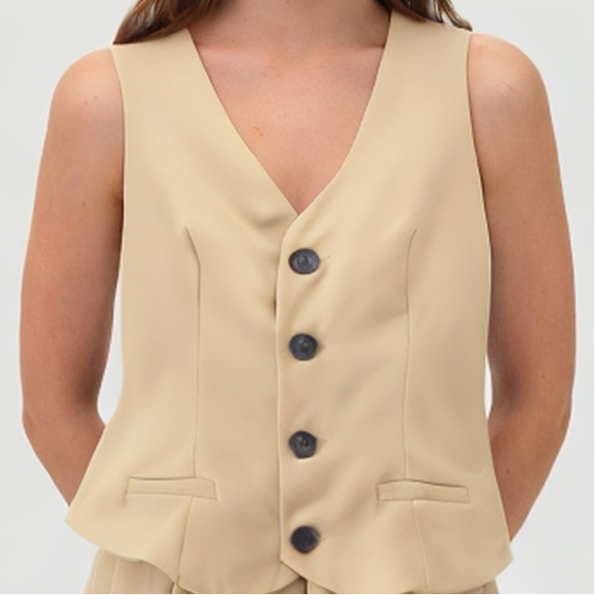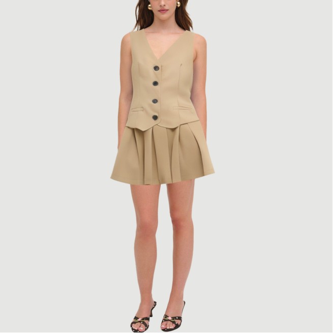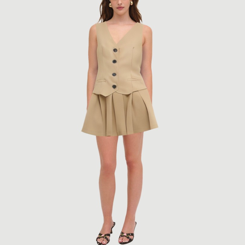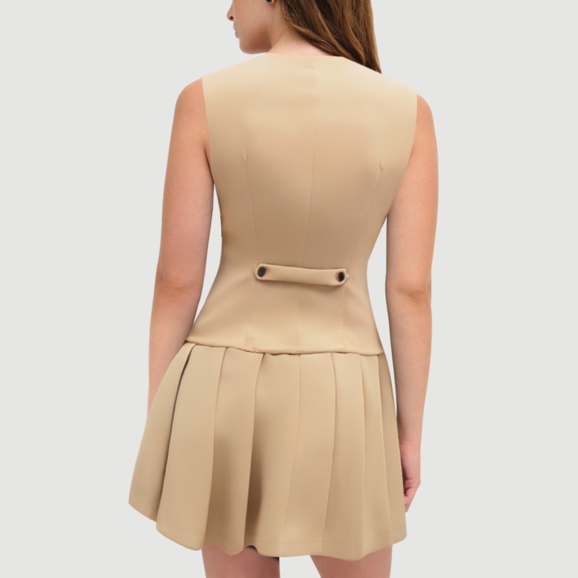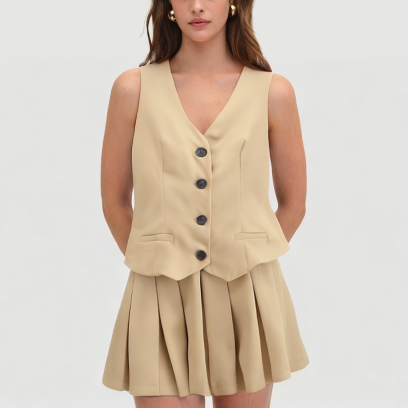 This dress features a simple, elegant V-neck design and a sleeveless silhouette, showcasing the graceful curves of the neck and arms for a refreshing and comfortable summer look. The delicate button embellishment on the front not only enhances the overall design but also adds practicality, making it easy to put on and take off. The slim-fitting silhouette and mini-length skirt length accentuate the legs, creating a stylish yet casual look.The fabric is made of 100% polyester and woven with a fine, durable texture. It also offers excellent breathability and a lightweight feel, ensuring comfortable, breathable wear for extended periods. The natural, warm khaki hue is versatile, perfect for everyday outings, casual gatherings, or casual dates.The overall design combines practicality with aesthetics, making it a versatile addition to the modern woman’s summer wardrobe, ideal for both style and comfort.Care Instructions:Hand wash in cold water with a mild neutral detergent and avoid bleach. When machine washing, turn the garment inside out, place in a laundry bag, and select the gentle cycle. Keep the water temperature below 30°C to prevent shrinkage and fabric damage. Gently squeeze out excess water and avoid wringing to preserve the fabric’s elasticity. Hang to dry in a cool, well-ventilated area, away from direct sunlight, which can cause fading. Use a low heat setting when ironing to avoid damaging the fabric and buttons. Wash separately from similarly colored items to prevent staining and contamination.