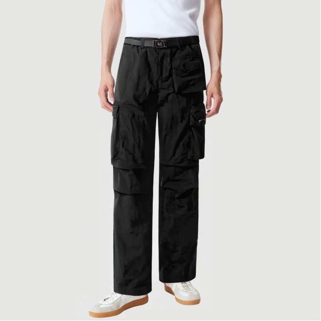 Inspired by the style of paratroopers, these men’s trousers feature a pleated design and a solid, loose, wide-leg fit, creating a versatile pair of casual pants that combines practicality and style. The relaxed fit and ample legroom provide excellent freedom of movement and comfort, making them suitable for a variety of daily wear and outdoor activities. The simple, solid-color design easily pairs with a variety of tops and shoes, showcasing a stylish yet understated style.The fabric is made of high-quality nylon knit, which combines lightness and durability. Nylon offers excellent breathability, ensuring comfort for extended wear, while also being abrasion-resistant and wrinkle-resistant, making it suitable for diverse and challenging environments. The knitting process enhances the fabric’s elasticity and softness, allowing the pants to fit the body perfectly without sacrificing a loose feel, ensuring flexibility and comfort during activities.The pleated design adds layering and visual intensity, combining the rugged elements of the paratrooper style to create a seamless fusion of retro military flair and modern style. The wide-leg silhouette not only reflects current trends but also effectively flatters the leg, enhancing the overall look’s stylish and practicality.Care Instructions:Hand wash in cold water or machine wash on the gentle cycle to avoid damaging the fabric with high temperatures.Use a mild neutral detergent; avoid bleach and strong alkaline products.Turn the pants inside out before washing to protect the fabric and pleats.Avoid prolonged soaking to prevent fading and warping.Air dry; avoid direct sunlight, which can cause fading and hardening.Iron on a low heat setting, avoiding direct ironing on the pleated area to protect the details.Dry cleaning and tumble drying are not recommended to prolong the life of the pants and maintain their shape.