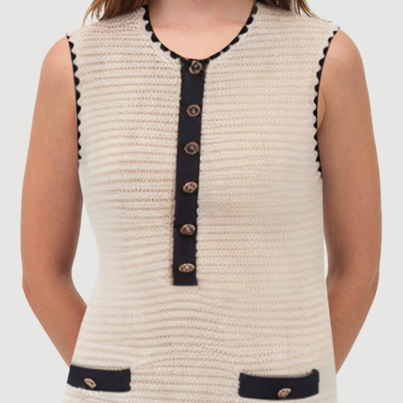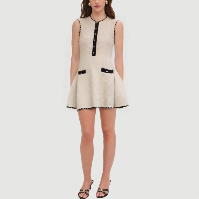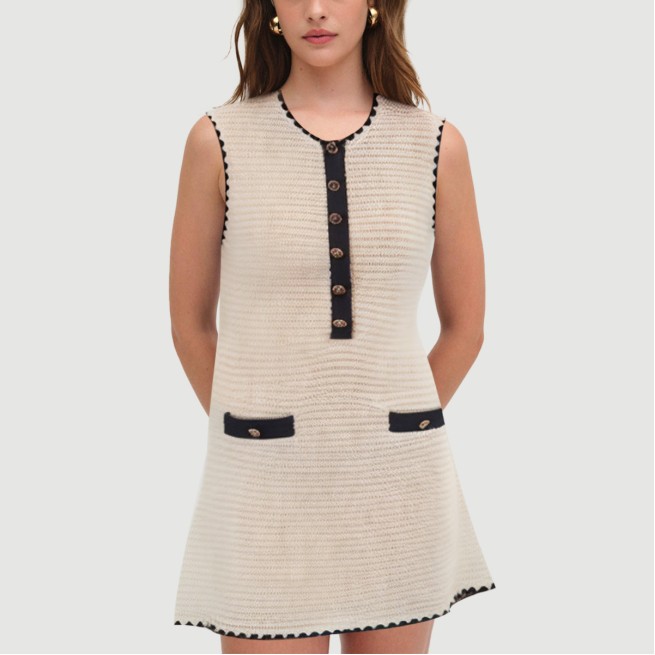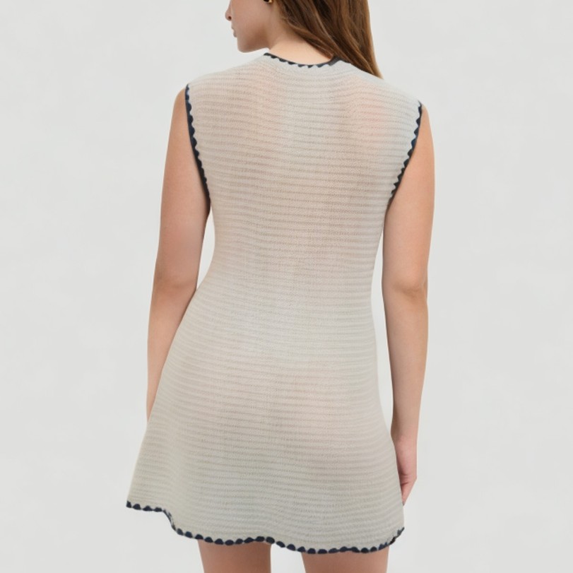 Designed with freshness and comfort in mind, this dress combines classic and modern elements, offering a relaxed yet sophisticated look for the modern woman. The A-line silhouette drapes naturally without clinging to the body, cleverly framing the waist and hips for a clean, airy, and ethereal look.The dress is finely knitted from a premium viscose and nylon blend, creating a smooth, delicate feel. It offers a lightweight, close-fitting fit and excellent breathability, making it ideal for warm summer weather. The solid color scheme, combined with a dyeing process, creates a rich, uniform hue, enhancing the overall clean and elegant look. It easily coordinates with a variety of shoes and accessories, perfect for any occasion.The O-neck design offers a smooth, natural look that flatters the neckline, creating a soft yet sophisticated look. The sleeveless design allows for greater freedom of movement and a refreshing feel, making it perfect for casual summer outings, vacations, or gatherings with friends. Hollow details are strategically placed in select areas of the skirt, cleverly combining a three-dimensional weave with a regularly arranged pattern to enhance the dress’s design and breathability. This dress is not only beautiful and practical, but also lends a refreshing summer vibe.As a casual dress, it’s designed for practicality and comfort, yet retains refined details and a high-quality aesthetic. It’s perfect for everyday wear for women who appreciate a natural and stylish look.Care Instructions:Hand wash in cold water to preserve the integrity of the knit structure and hollow design.If machine washing is desired, place inside out in a laundry bag and use the gentle cycle to avoid vigorous agitation that may cause snagging. Keep the water temperature below 30°C, and do not use bleach or chlorine-containing detergents. Gently squeeze out the excess water after washing; do not wring it out to prevent stretching or warping. Air dry in a cool, well-ventilated area, avoiding direct sunlight that may cause fading. Avoid high-temperature ironing. If ironing is necessary, use low-temperature conditions on the inside out to avoid damaging the fibers. Wash separately from similar colors to prevent staining.
