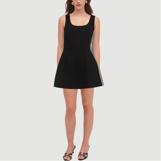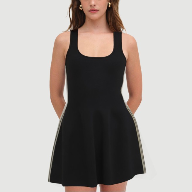 This dress, designed with a sweet and sexy aesthetic, is a versatile piece suitable for both everyday and casual wear. The classic A-line silhouette naturally flatters the figure, showcasing an elegant yet energetic feminine allure. The mini length visually elongates the legs, and the thin straps create a perfect shoulder and neckline, highlighting a sexy yet understated look.The dress is crafted from a stretchy and breathable nylon and viscose blend knit fabric that is soft and soft against the skin while contouring to the body for a comfortable and flexible fit. The fine and even weave ensures the overall shape and texture of the dress, making it suitable for spring and summer. It can also be paired with a cardigan or jacket for a more sophisticated look.Stripes throughout the dress add a playful and sweet touch, creating a visually appealing and multi-dimensional effect. A hidden logo detail at the back of the dress adds a simple yet high-quality touch, enhancing the overall style. The cleverly integrated pockets enhance the practicality and add a touch of modern flair.Our products undergo professional needle-checking to ensure the quality and reliability of each dress. The cuffs and collar are meticulously detailed, and despite the thin straps, they offer excellent stability and a secure fit.Care Instructions:Hand wash recommended, or machine wash on the gentle cycle with a laundry bag. Wash in cold water, no higher than 30°C. Use a neutral detergent and avoid detergents containing bleach. Do not wring out, gently spin dry, and then hang to dry. Avoid direct sunlight; air dry in a cool, dark place. Iron at a temperature of no more than 110°C, and iron on the reverse side. Wash separately from similar colors to avoid staining.