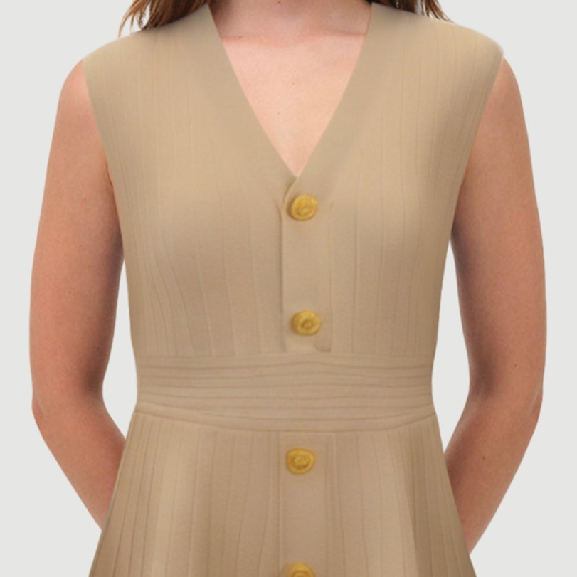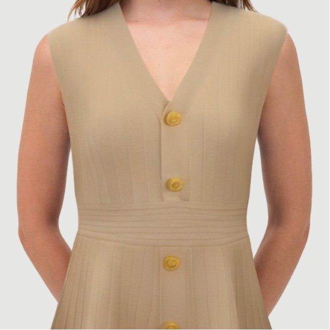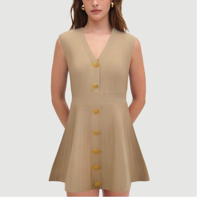 This French-inspired women’s knit skirt exudes a retro chic vibe with its simple yet sophisticated design. Crafted from high-quality polyester, it’s soft and breathable, offering a comfortable fit. The knit fabric, combined with dimensional cutting techniques, creates a naturally flattering fit, highlighting the woman’s curves.The V-neck and sleeveless design complement each other, cleverly elongating the neckline and creating a sharp, streamlined look. Perfect for spring or milder weather. The classic mini length adds a touch of playfulness and flirtation. Wear it alone or with a cardigan or trench coat for a variety of looks.The solid-color dyeing process creates a rich, even hue. The single-breasted front button embellishment enhances ease of entry and adds a touch of French elegance. Each skirt undergoes meticulous needle inspection before shipment to ensure quality assurance. The standard thickness allows for comfortable wear in most weather conditions, ensuring both practicality and style.Care Instructions:Hand wash or machine wash on the gentle cycle recommended. Water temperature should not exceed 30°C/35°F. Do not bleach. Avoid prolonged soaking. Hang to dry out of direct sunlight. Iron at a maximum temperature of 110°C/150°F. Wash with like colors.